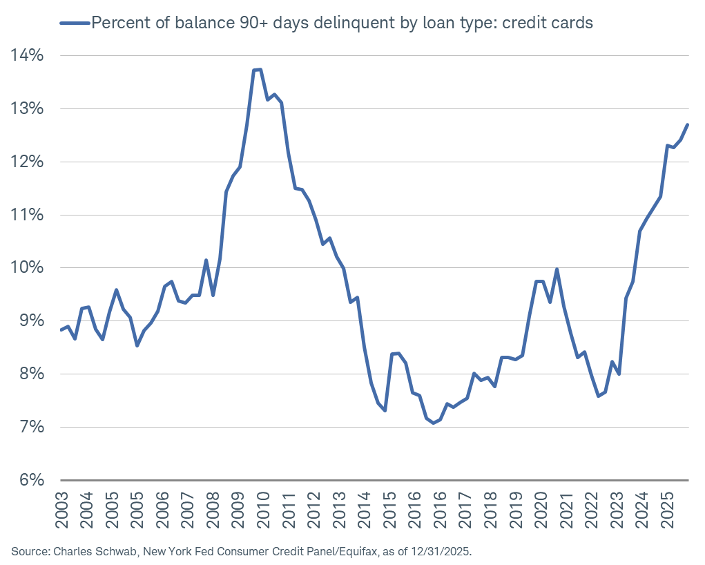 現在、クレジットカードの借入残高の12.7%が深刻な延滞(90日以上の未払い)に陥っており、これは歴史上2番目に高い水準です。過去にこれを上回ったのは、リーマンショック後の世界金融危機の時だけでした。つまり、多くの人がカード借金を返せず、個人の財務状況や消費者信用のリスクが大幅に高まっていることを示しています。経済全体への影響も無視できず、銀行や金融機関の貸し倒れリスクが増加している可能性があります。