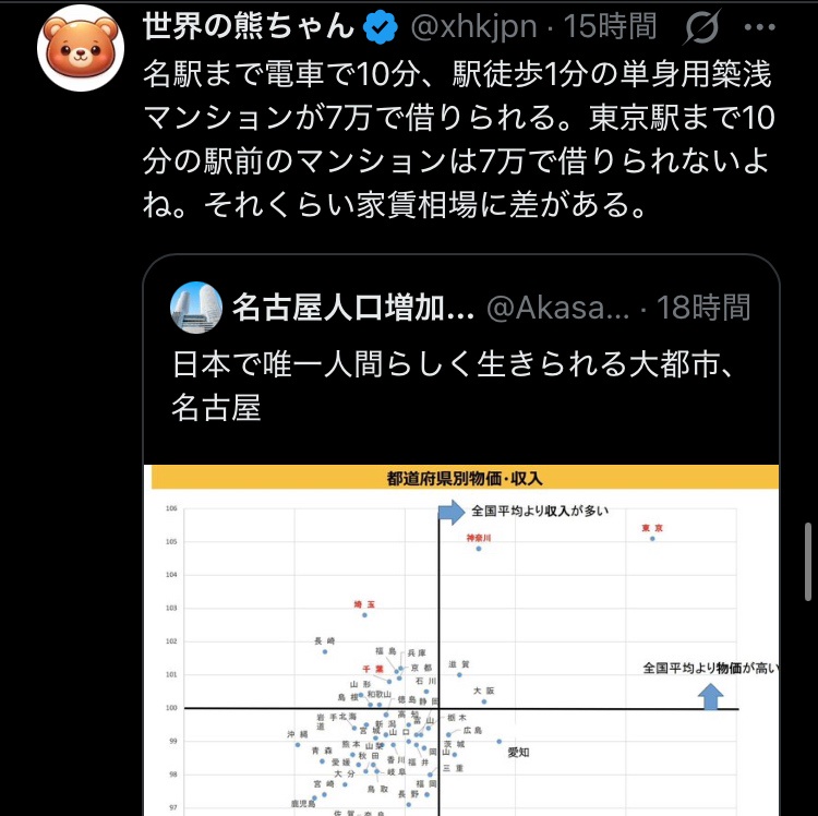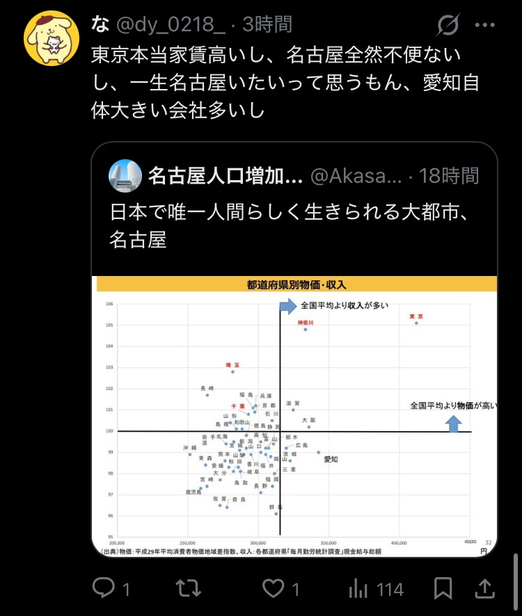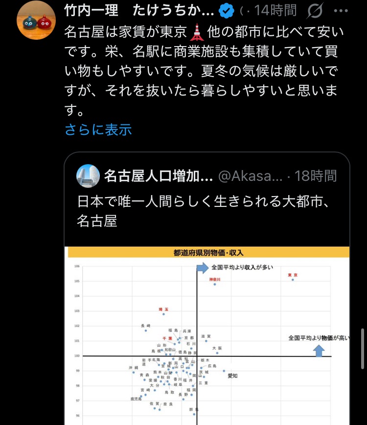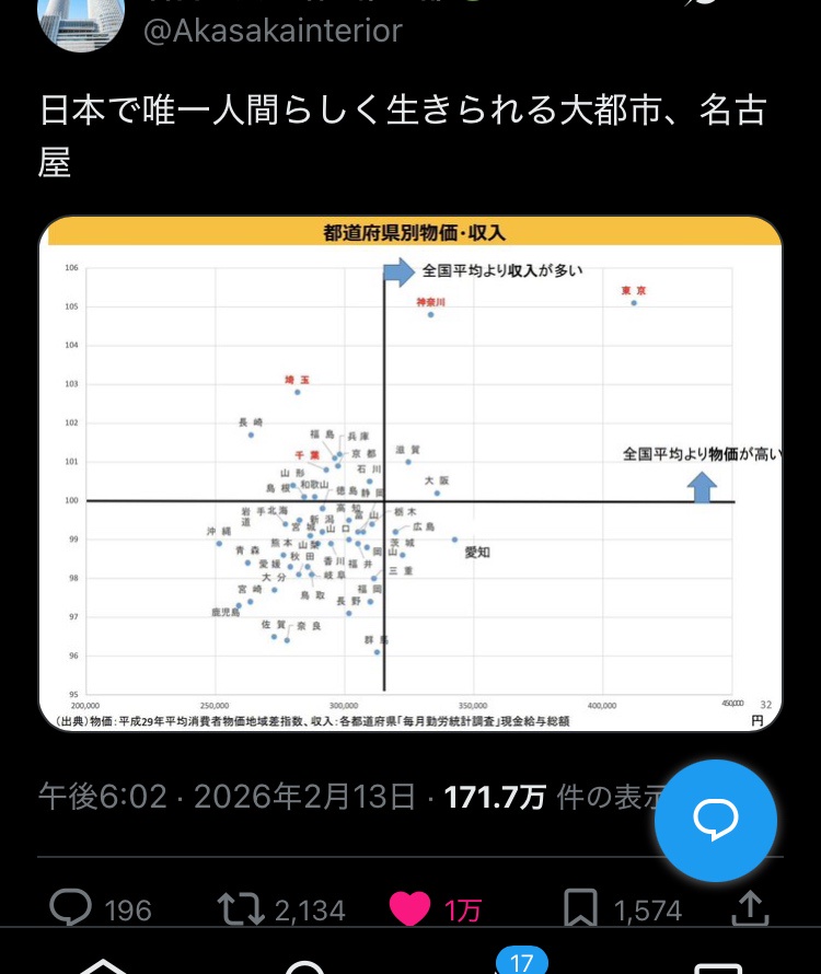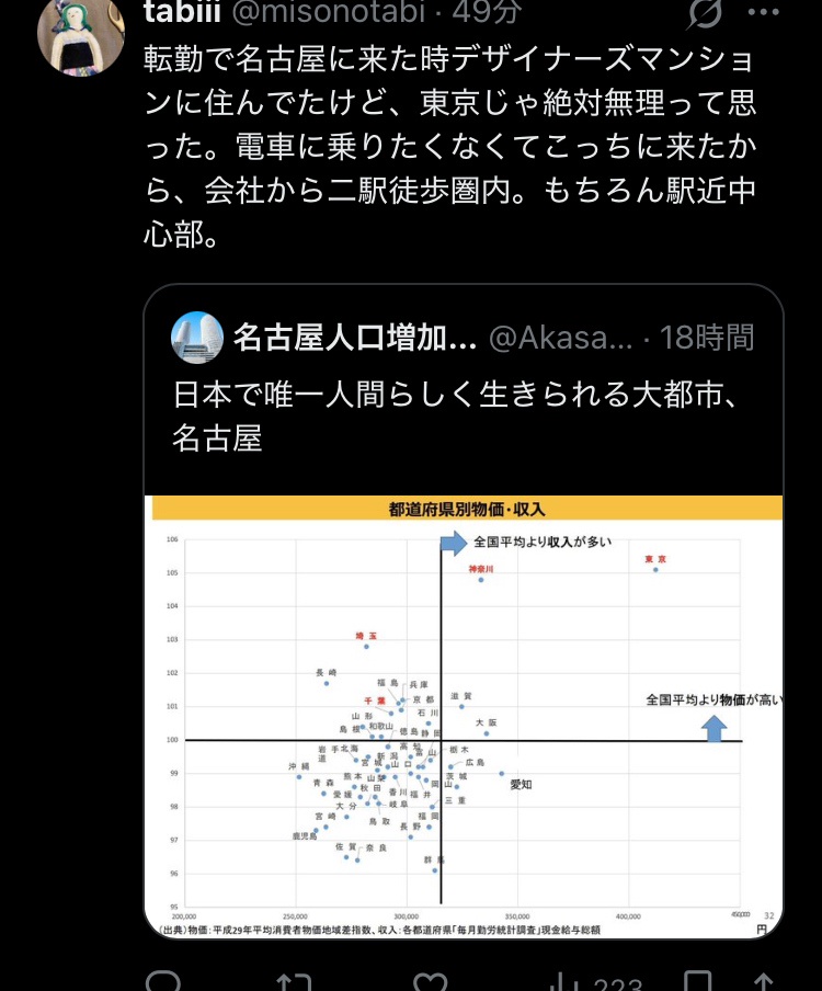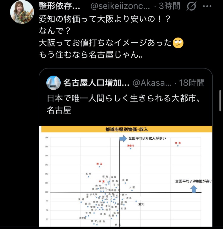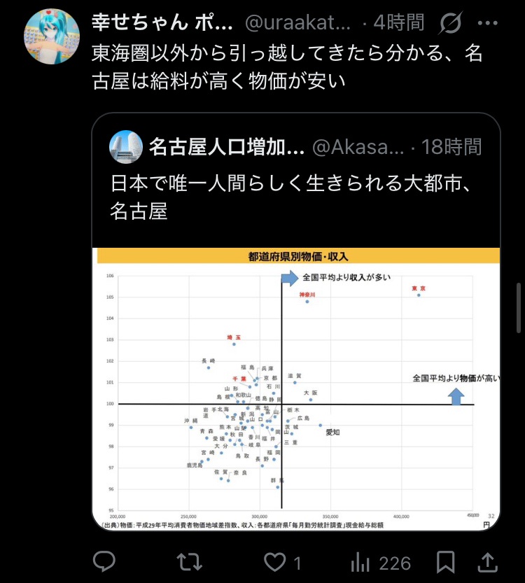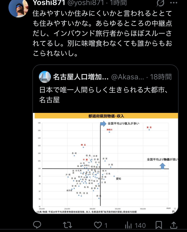 【画像】X「待って…名古屋って給料高くて家賃安いから人間らしく暮らせる唯一の都市じゃん」1万いいね