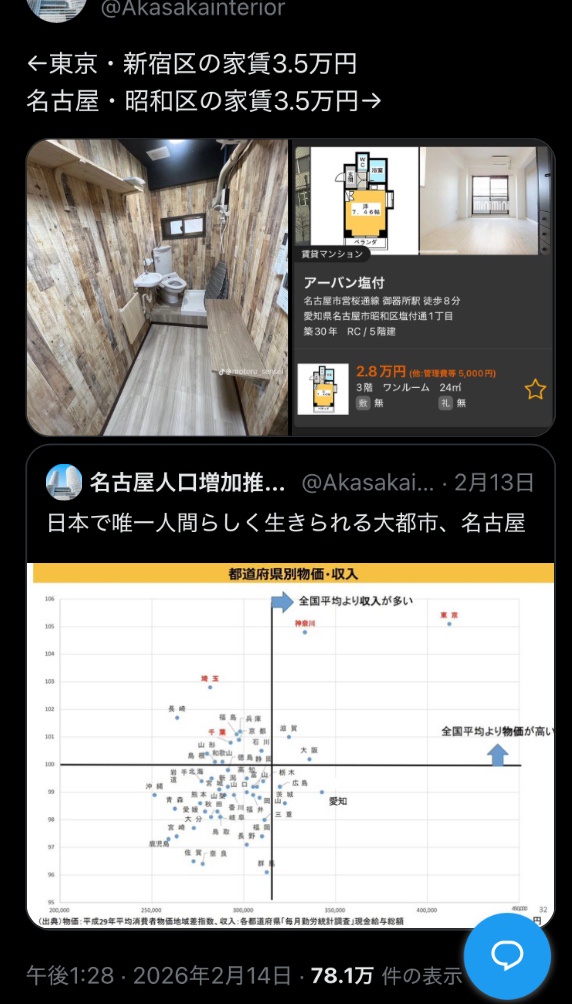 【画像】東京と名古屋の家賃3.5万の比較がこちら、X大炎上WWWWWWW