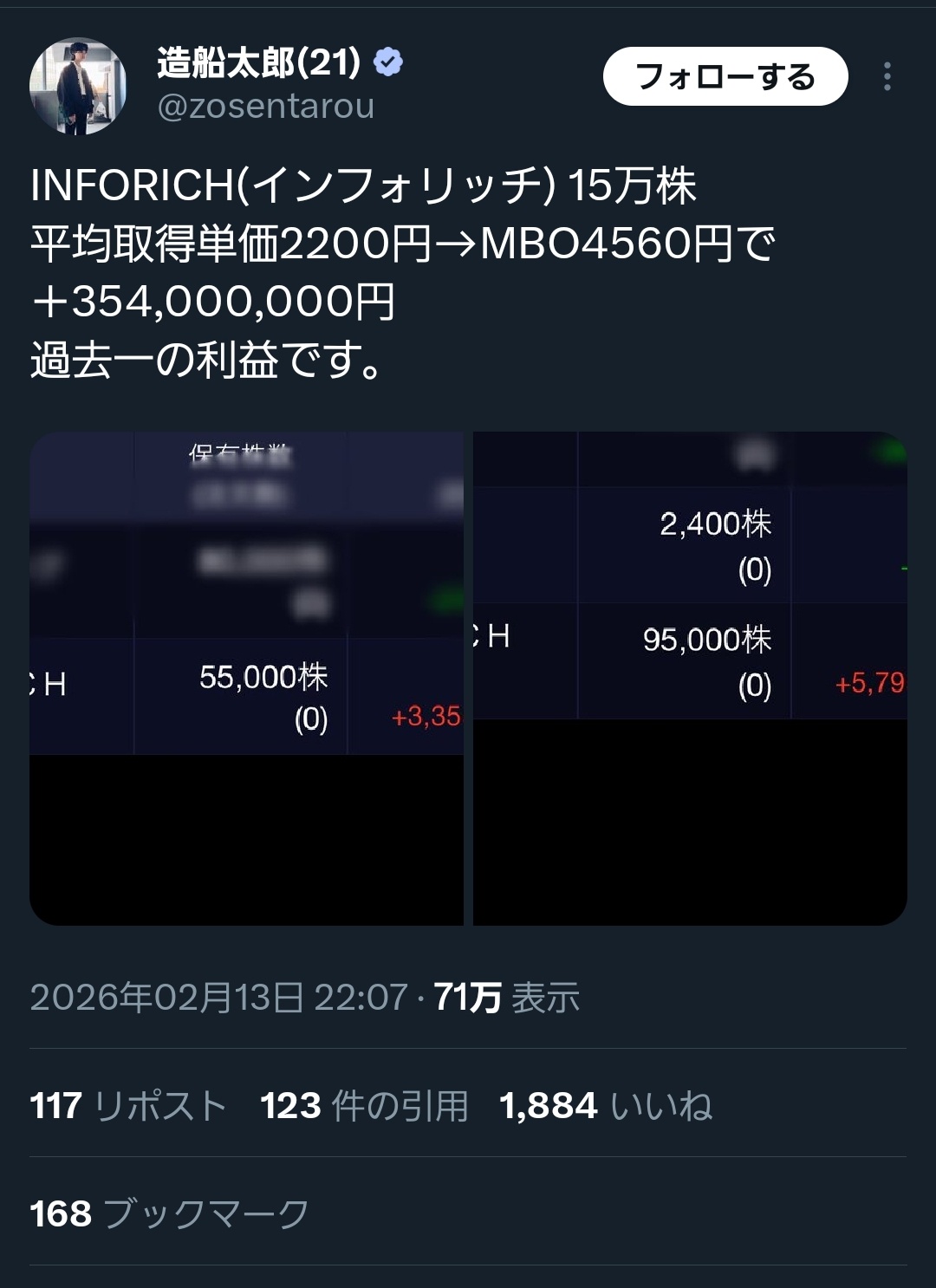 造船太郎さんの友人やん氏「6時間後にMBOされた!インサイダーではありません。今日(決算発表日)からコツコツ買っていこうと思ってた」