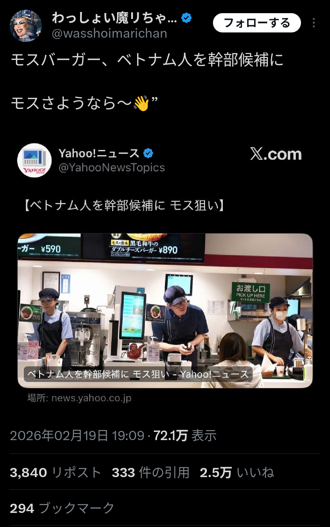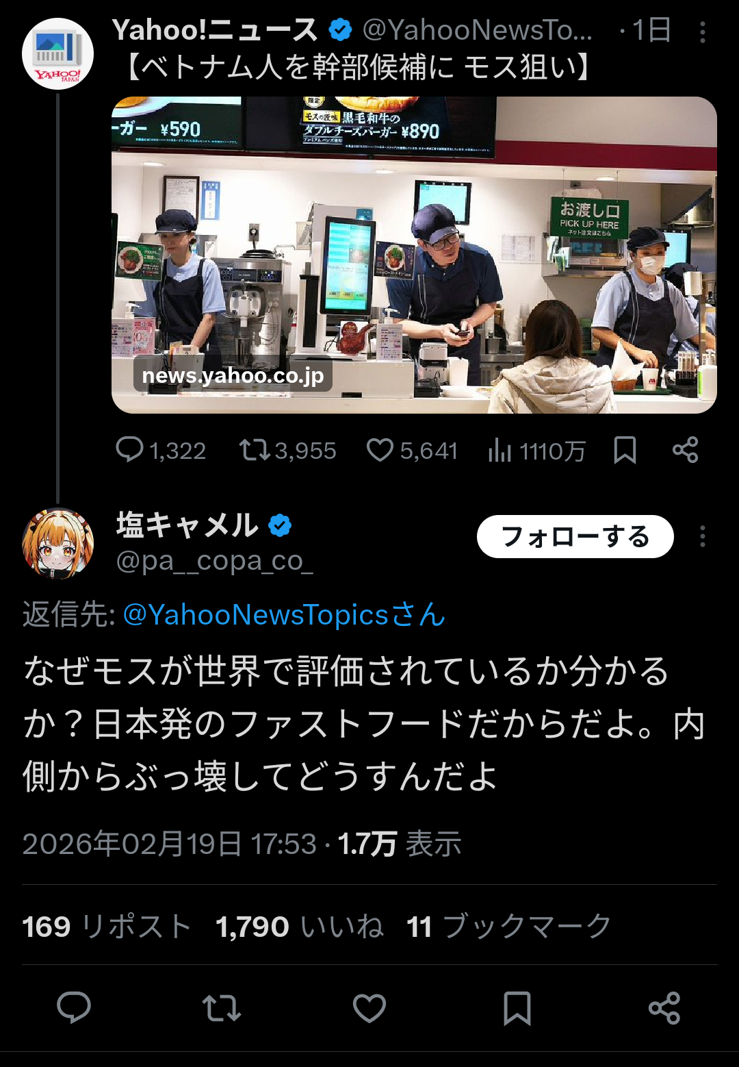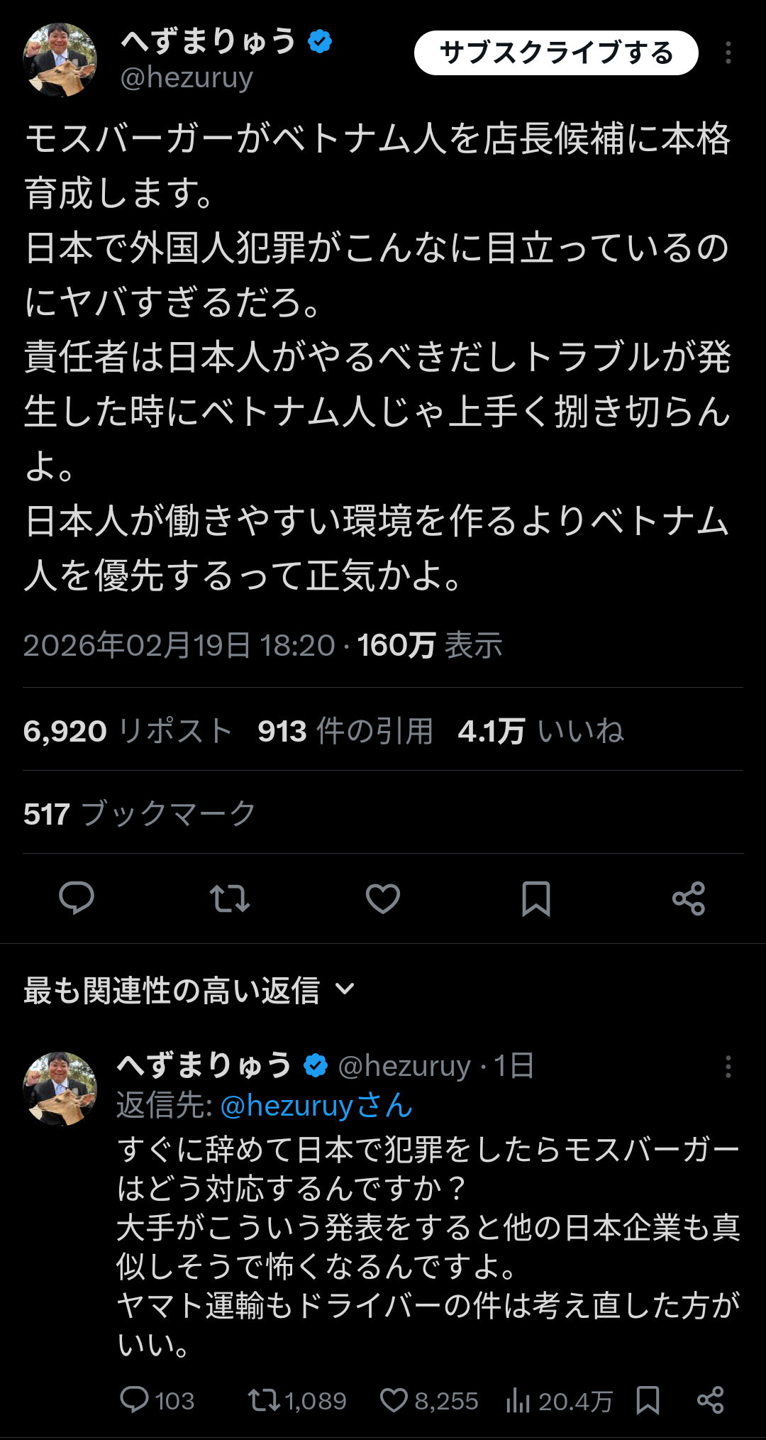 【悲報】モスバーガーさん、ベトナム人を店長にしてしまい炎上。大物保守活動家らも非難開始