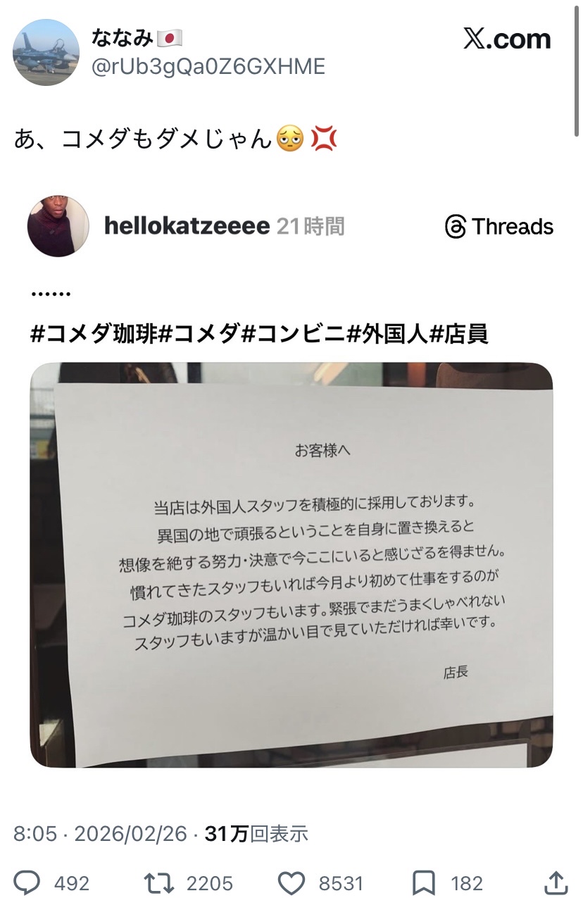 【悲報】コメダ珈琲「外国人スタッフを積極的に採用します」右翼「不買運動を開始する」