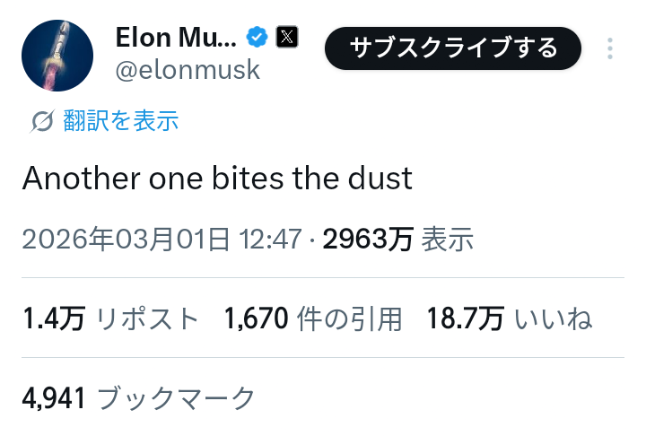 【画像】イーロン・マスクさん、Xで謎のつぶやきをする