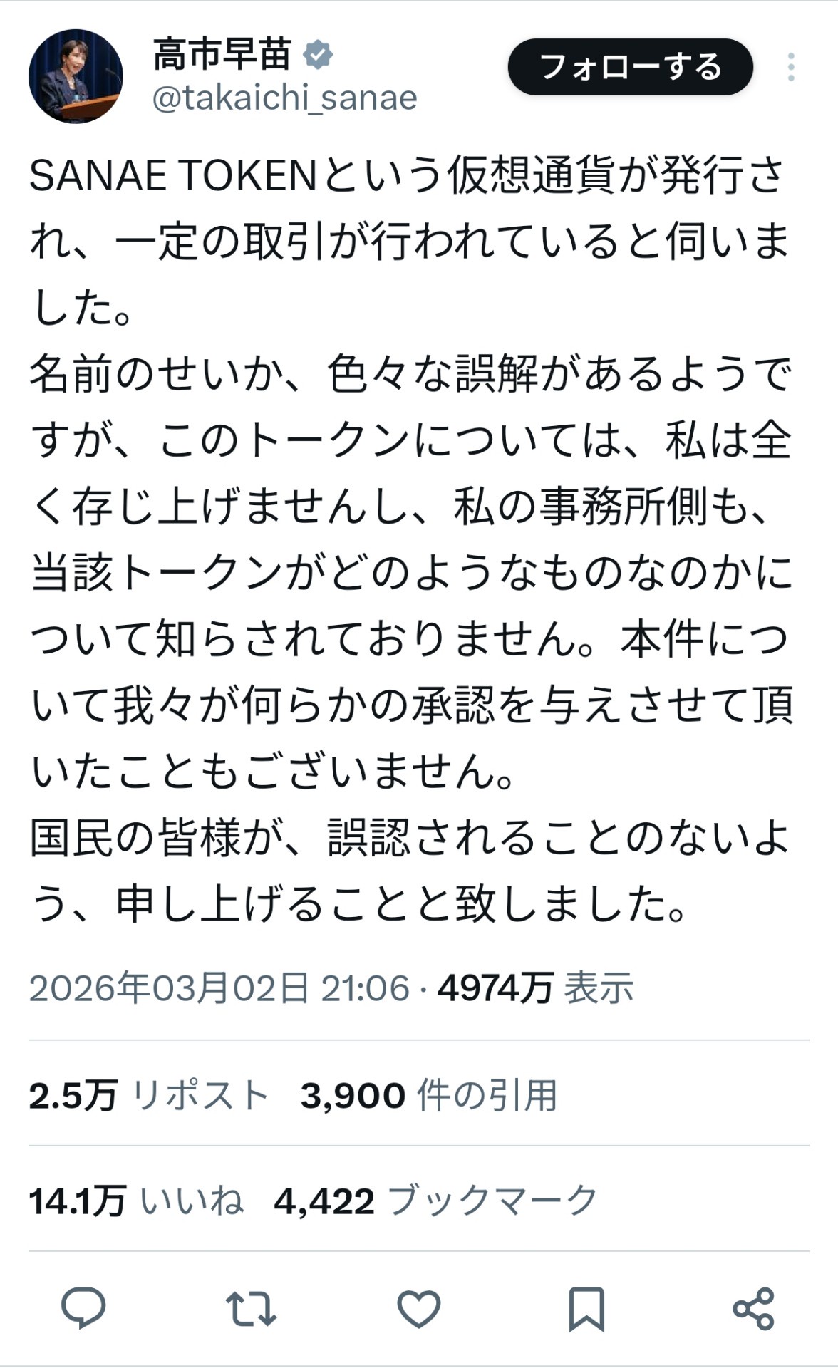 【悲報】高市総理がまったく知らない間に仮想通貨「SANAE TOKEN」が爆誕、総理本人が公式Xで注意喚起