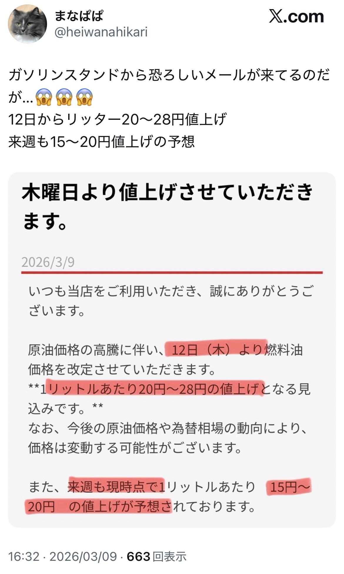 【物価高】ガソリン、木曜日に25円の値上げ決定…来週には更に15円の値上げ予想…高市