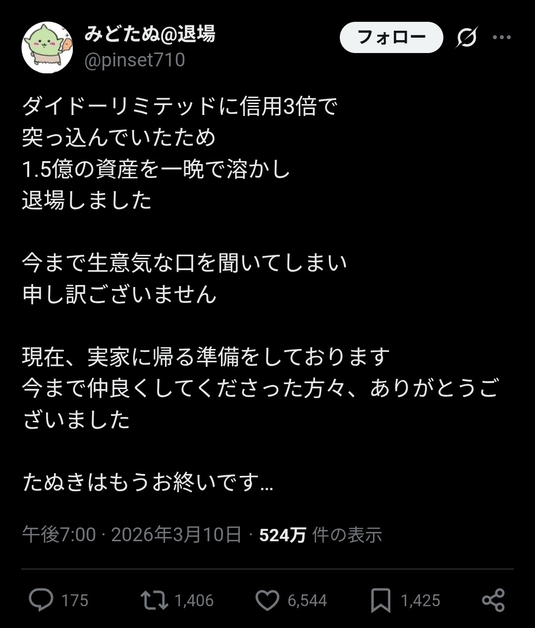 【悲報】投資家「みどたぬ」さん、一晩で全資産1億5千万円溶かして無事退場す