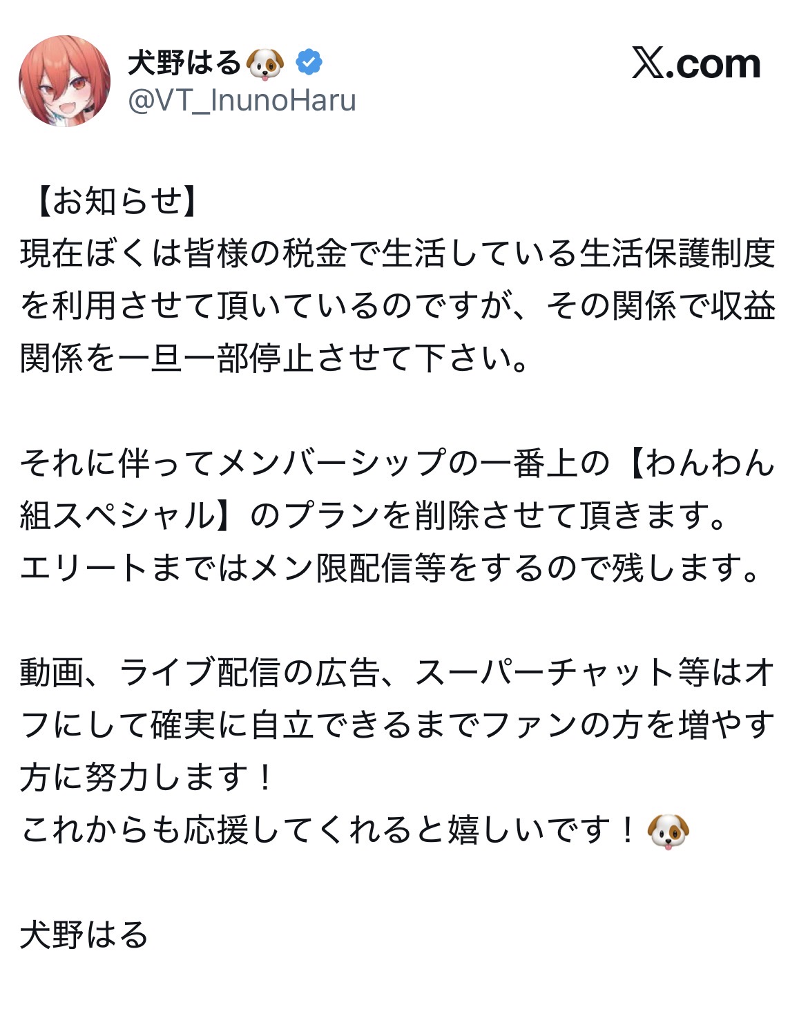 VTuberさん、生活保護を受けるために収益受け取りを停止する