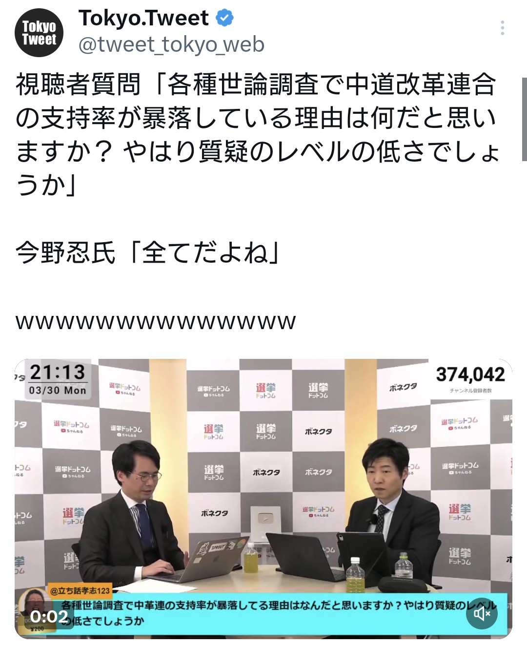 視聴者質問「各種世論調査で中革連の支持率が暴落している理由は何だと思いますか?」