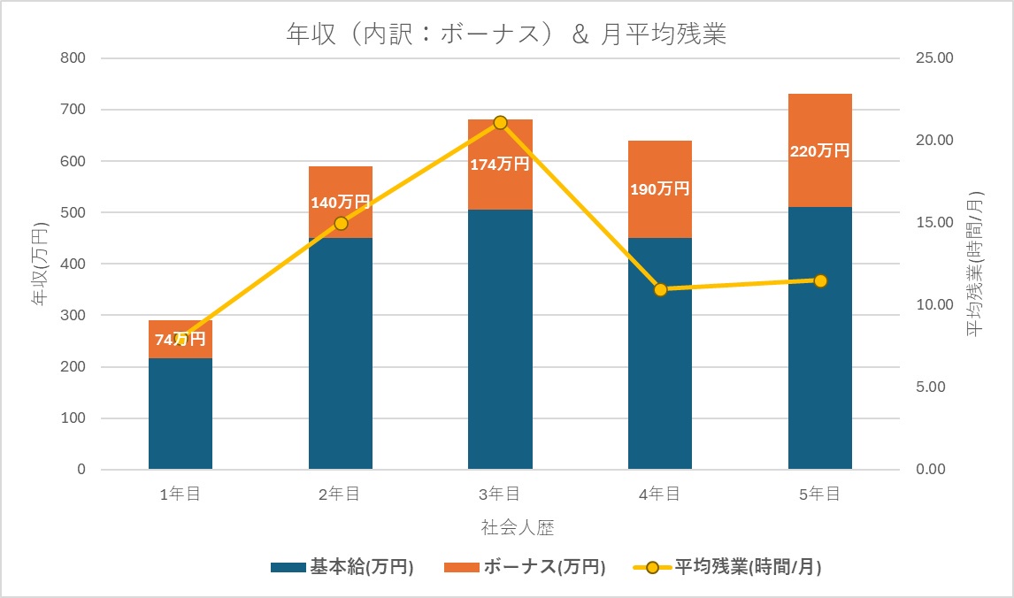 【速報】仕事だるいから年収と残業推移のグラフ作った!!!