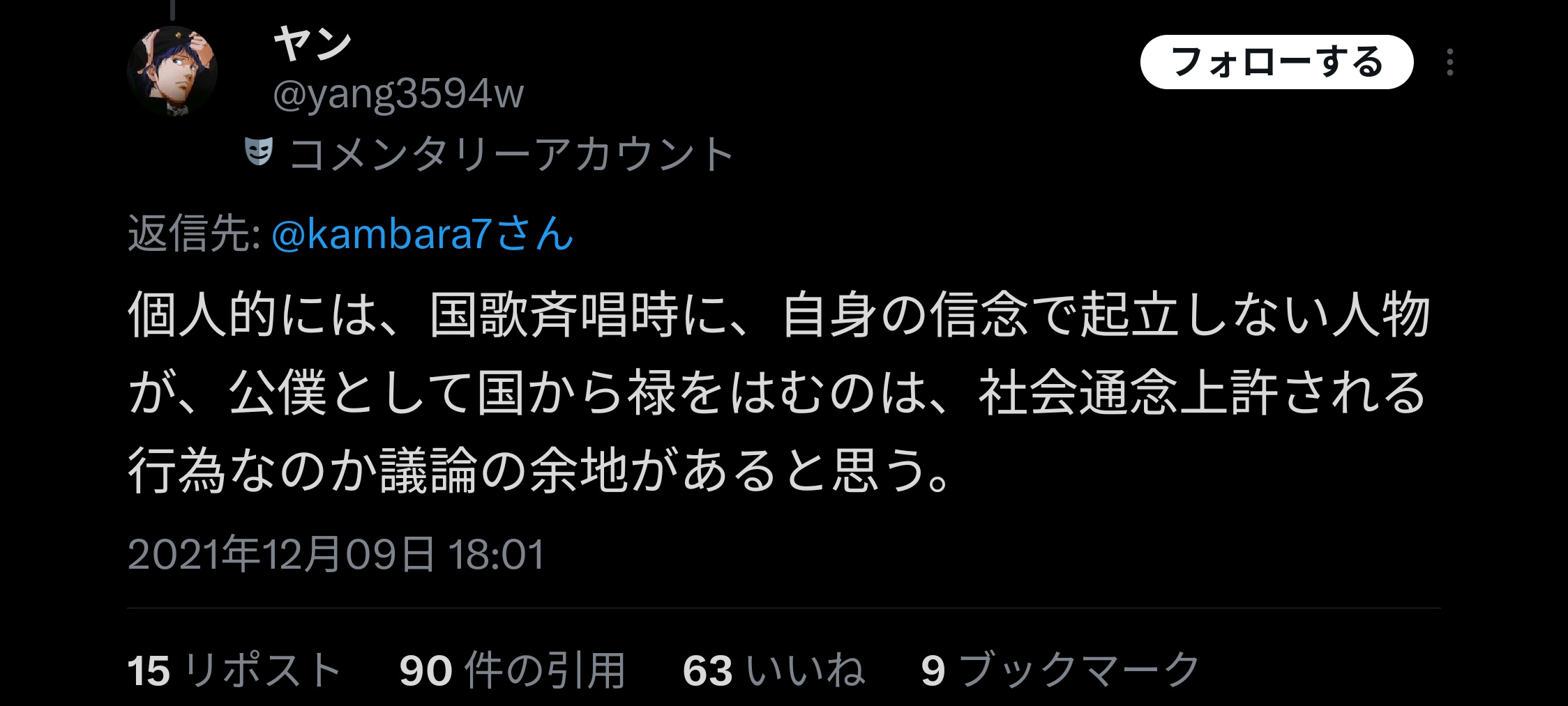 ヤン・ウェンリー「国から給料を貰っている公務員が国歌斉唱で起立しないのは社会通念上許されない」