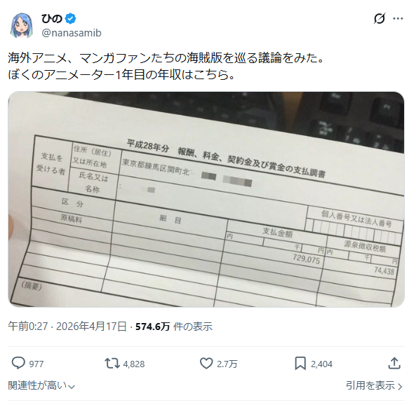 これはその通り。たとえ海賊版が消滅しても間違いなくアニメーターの収入は増えない。