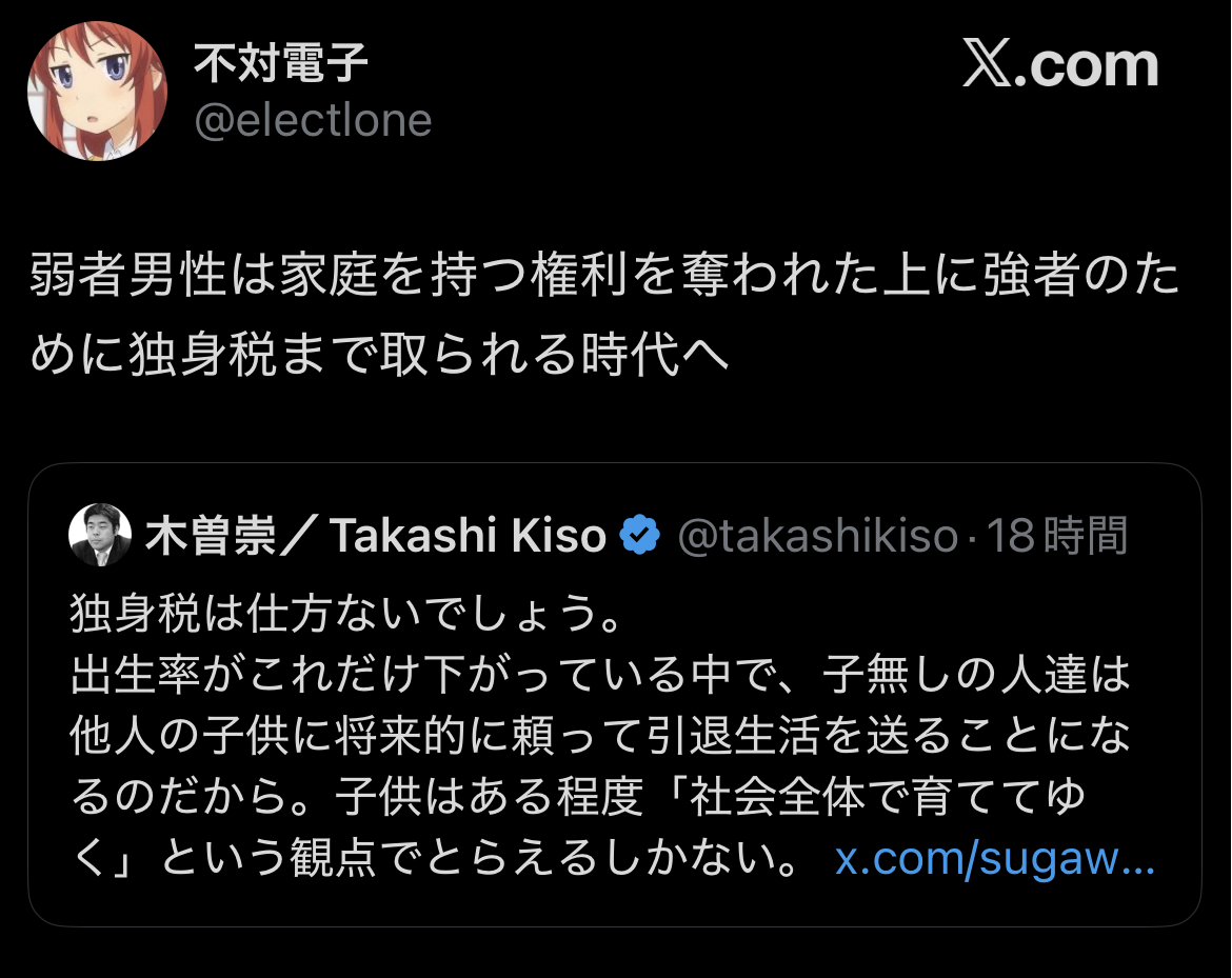 独身税集めて子供産んでくれてる日本人や外国人に配るのが人口維持する策ってのはアホじゃなきゃわかるはずだわ
