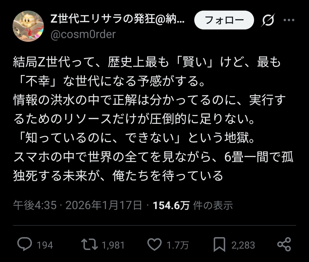 リテラシーが育ってないうえにパーソナライズされた情報ばっか摂取してるんやろな
