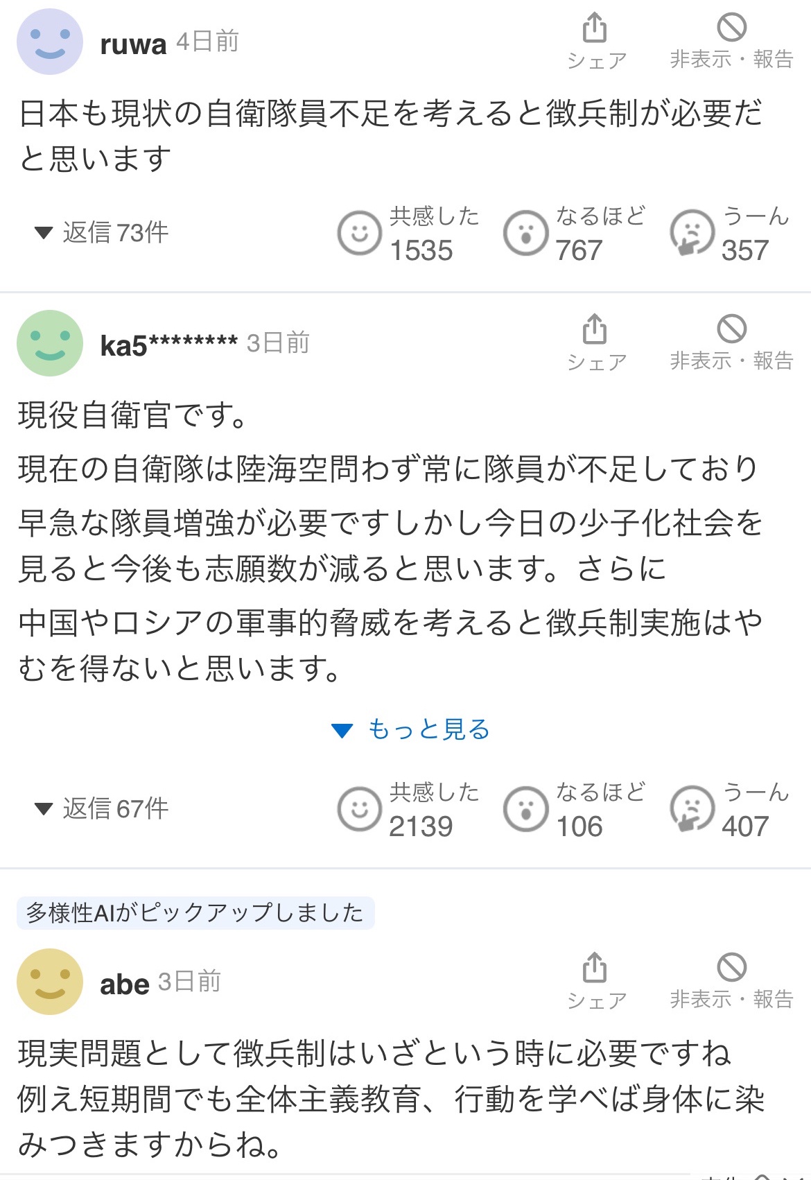 でも高市さんが血迷って徴兵制とか言い出したらリアルヤフコメ爺みたいな議員がめっちゃ賛同しそうだよな