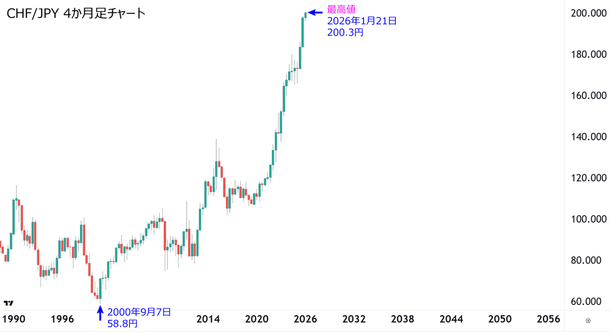 20日の外国為替市場でスイスフランが対円で初めて1フラン=200円台にのせた。21日も1フラン=200円台半ばのフラン高・円安で推移している。米欧の摩擦を意識したドル売りと財政拡張を懸念した円売りが進行する中で、相対的に安全な通貨とされるスイスフランに資金が流入した。