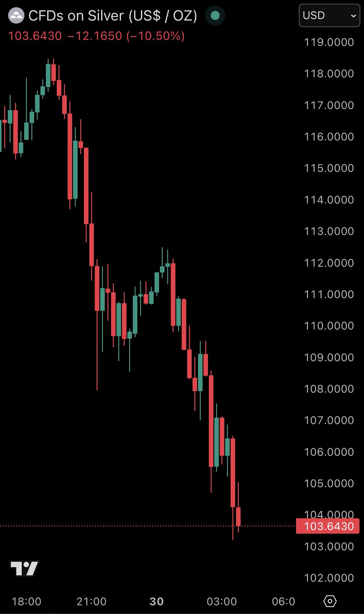 銀価格が本日さらに下落し、1オンスあたり104ドルを下回りました。下落率は日中で11%に達しています。