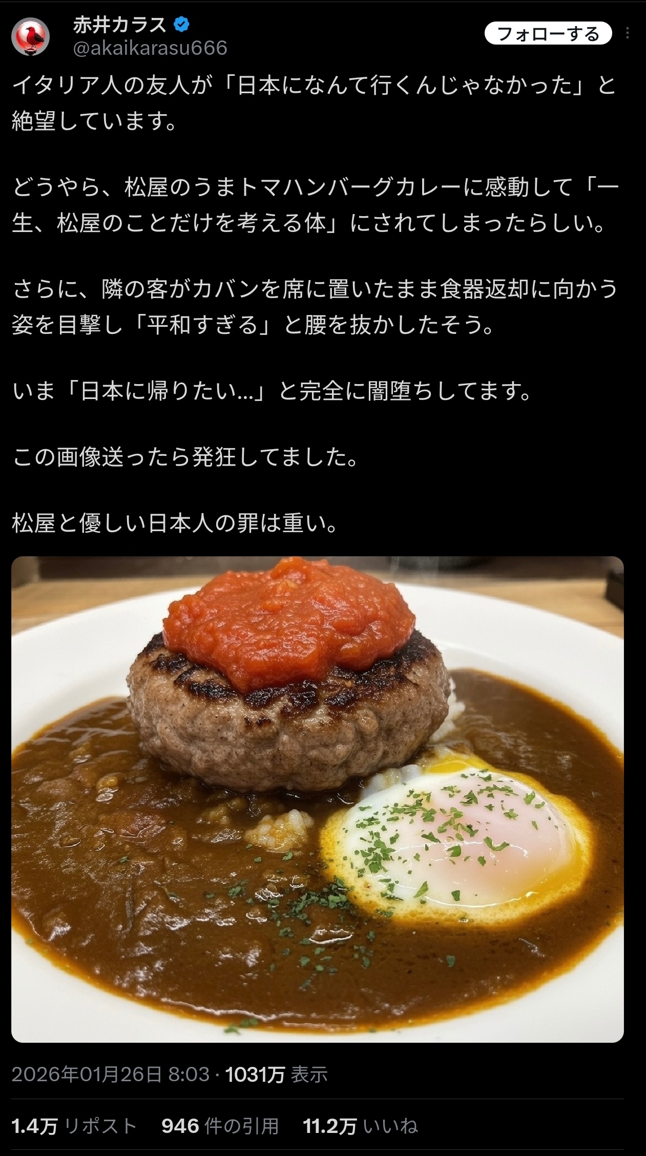 イタリア人、松屋のトマトハンバーグカレーを知ってしまい絶望。「日本に帰りたい…」