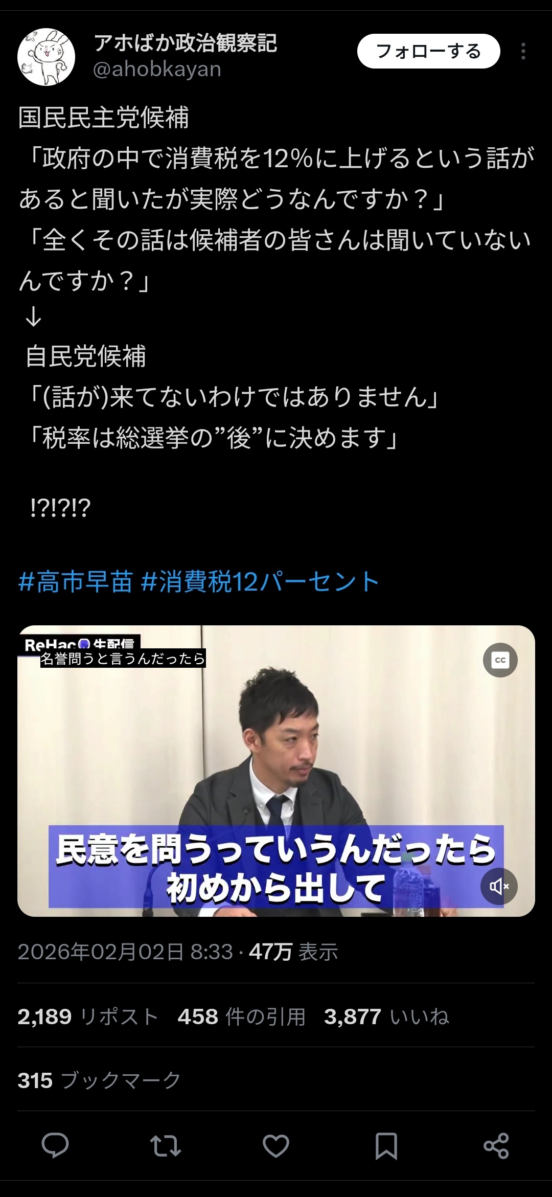 【悲報】高市政府、消費税12%増税浮上。自民候補者が発言
