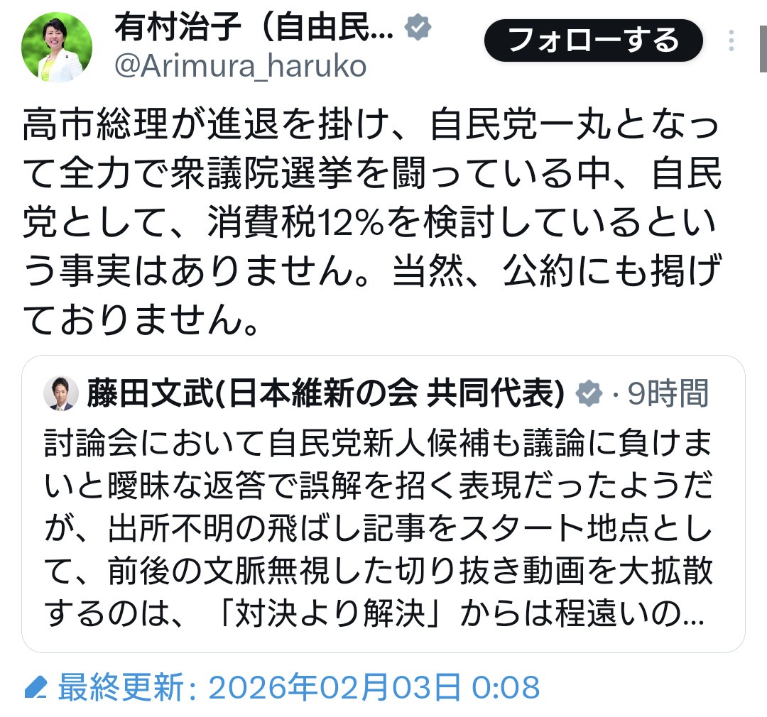 自民党内でも政府でも、消費税12%への議論をしている事実は全く無いことを確認しました。自民党の公約にもそのような記載はありません。