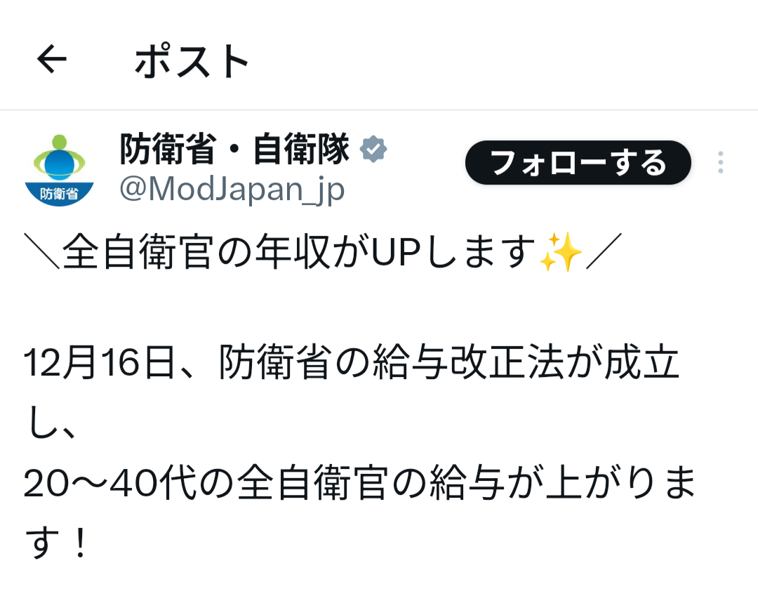 自衛官の給与増決定、高卒直後で月給24万円、一般大卒(22歳幹候)で32万円。新卒平均年収は485万円に