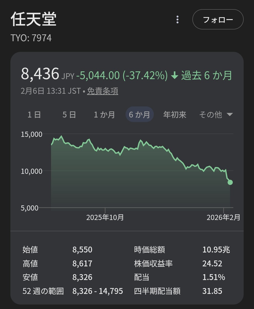 【悲報】任天堂さん、半年間で株価が37%下がっていたwwwww