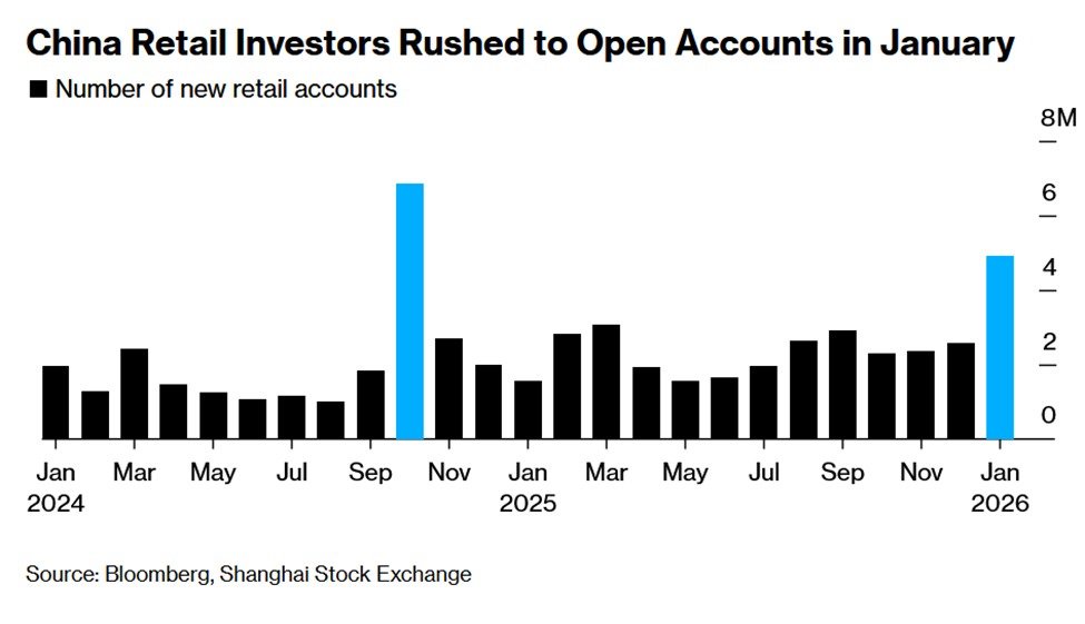 2026年1月、中国で新たに開設された個人投資家口座は前月比88%増の490万件となり、2024年10月以来の高水準になりました。参考までに、2024年10月のピークは680万件で、過去9年間で最大でした。2025年の平均は230万件です。