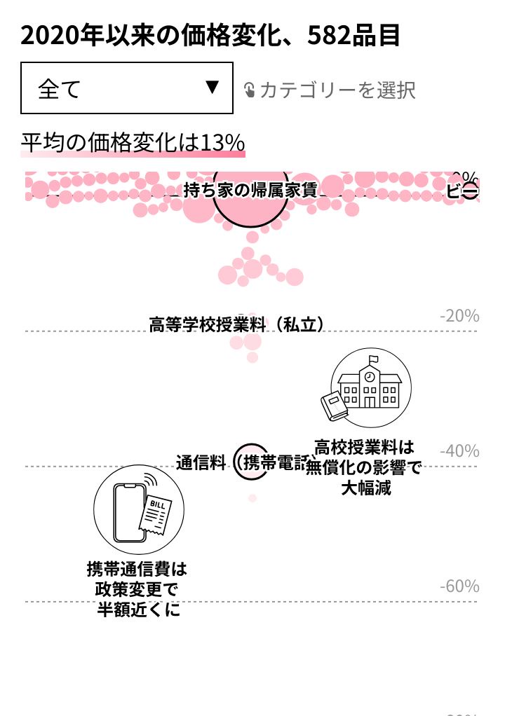 天候不順により主要な産地で不作が続いたコーヒー豆はここ5年で2.5倍、訪日客増を受けた宿泊料は1.7倍となり、ロードサービス料(1.7倍)や洗濯用洗剤(1.6倍)なども価格が上昇した。2020年時点に比べ1割以上値上がりしていたのは、昨年12月時点で393品目に上る。