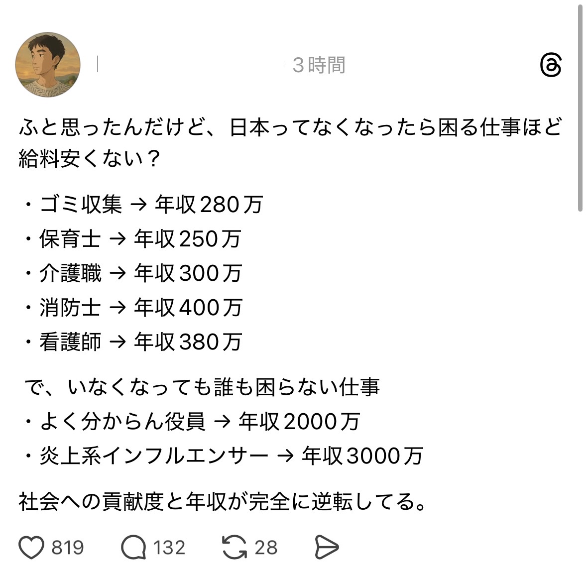 職業丸ごと無くなったら困るのはもちろんエッセンシャルワーカーなんだけど、一人単位で考えたら訳分からんインフルエンサーの方がデカいから仕方ないのよね
